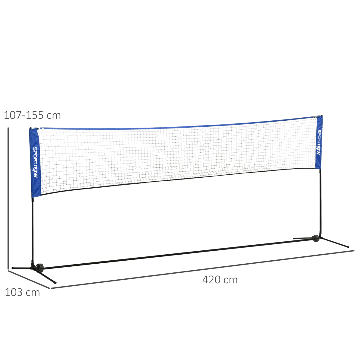 ● 107-155cm adjustable height – suitable for badminton, tennis, pickleball and volleyball ● A strong metal frame that’s resistant to rust ● Quick setup with side sleeves ● Feet at the bottom for stability ● Carry bag included ● Colour: Black and blue ● Material: Metal, PE and Oxford fabric ● Overall dimensions: 107-155H x 420L x 103Wcm. Net: 420L x 72Wcm. Mesh: 4L x 4Wcm ● Item label: A95-008V01BU